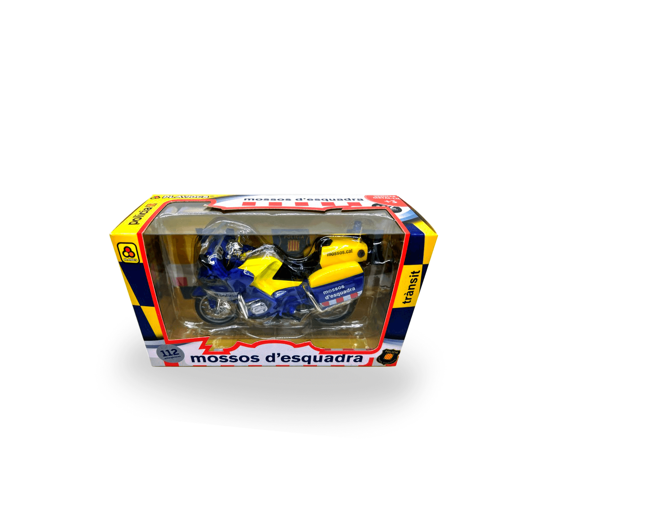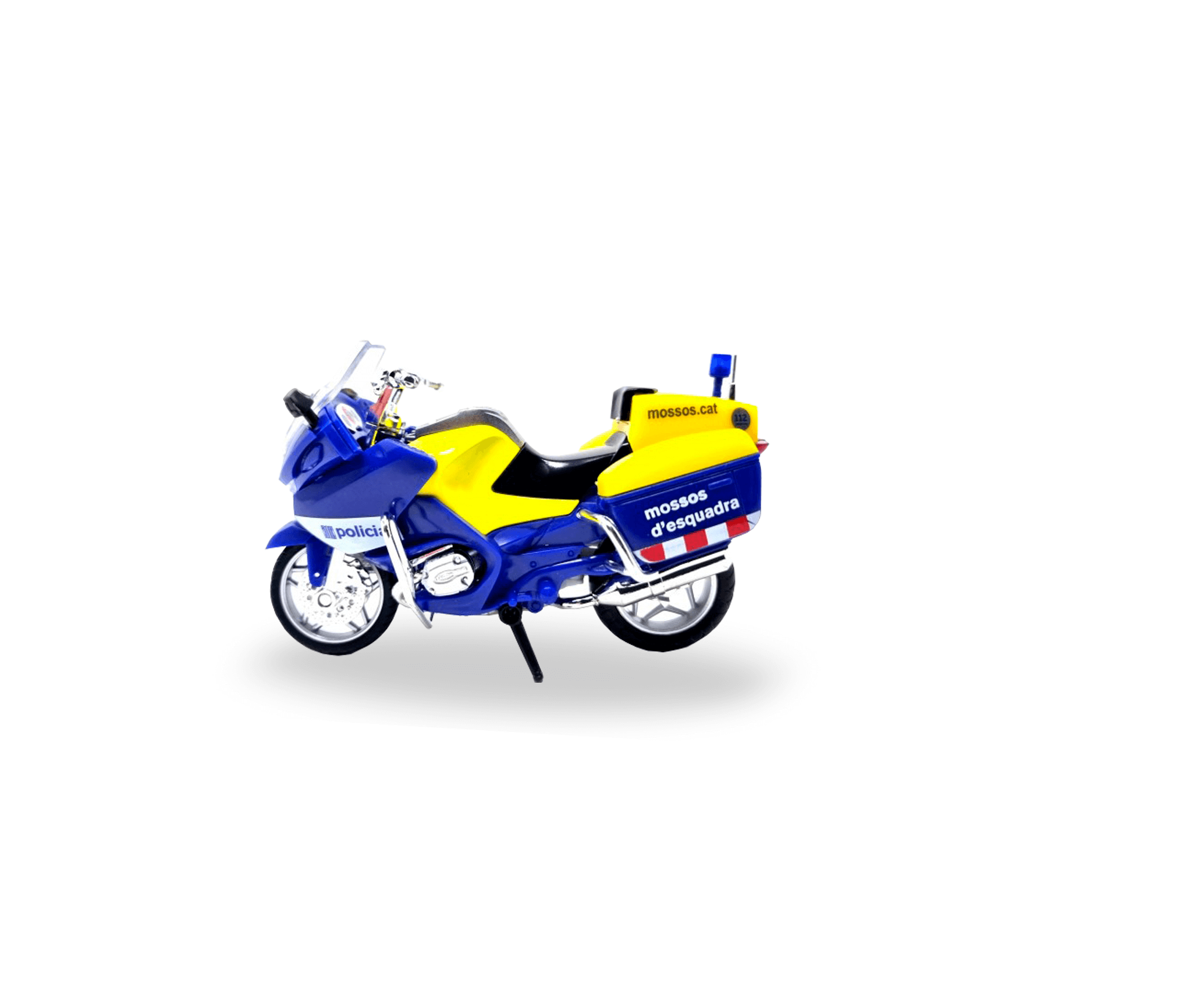 Añade a tu colección esta réplica de la moto patrulla de la unidad de tráfico de los Mossos d’Esquadra. Es un modelo de juguete detallado de 12,3 cm de largo, que reproduce fielmente la estética del cuerpo policial autonómico, incluyendo la rotulación oficial y el teléfono de emergencias 112. Cuenta con ruedas giratorias y caballete funcional para mantenerla de pie. Ideal tanto para el juego como para la exhibición en vitrina.